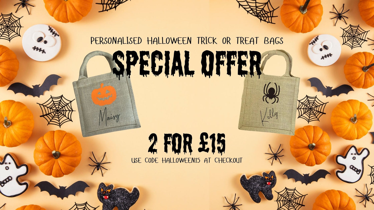 Halloween trick or treat bags personalised with name. Hessian tote jute bag.