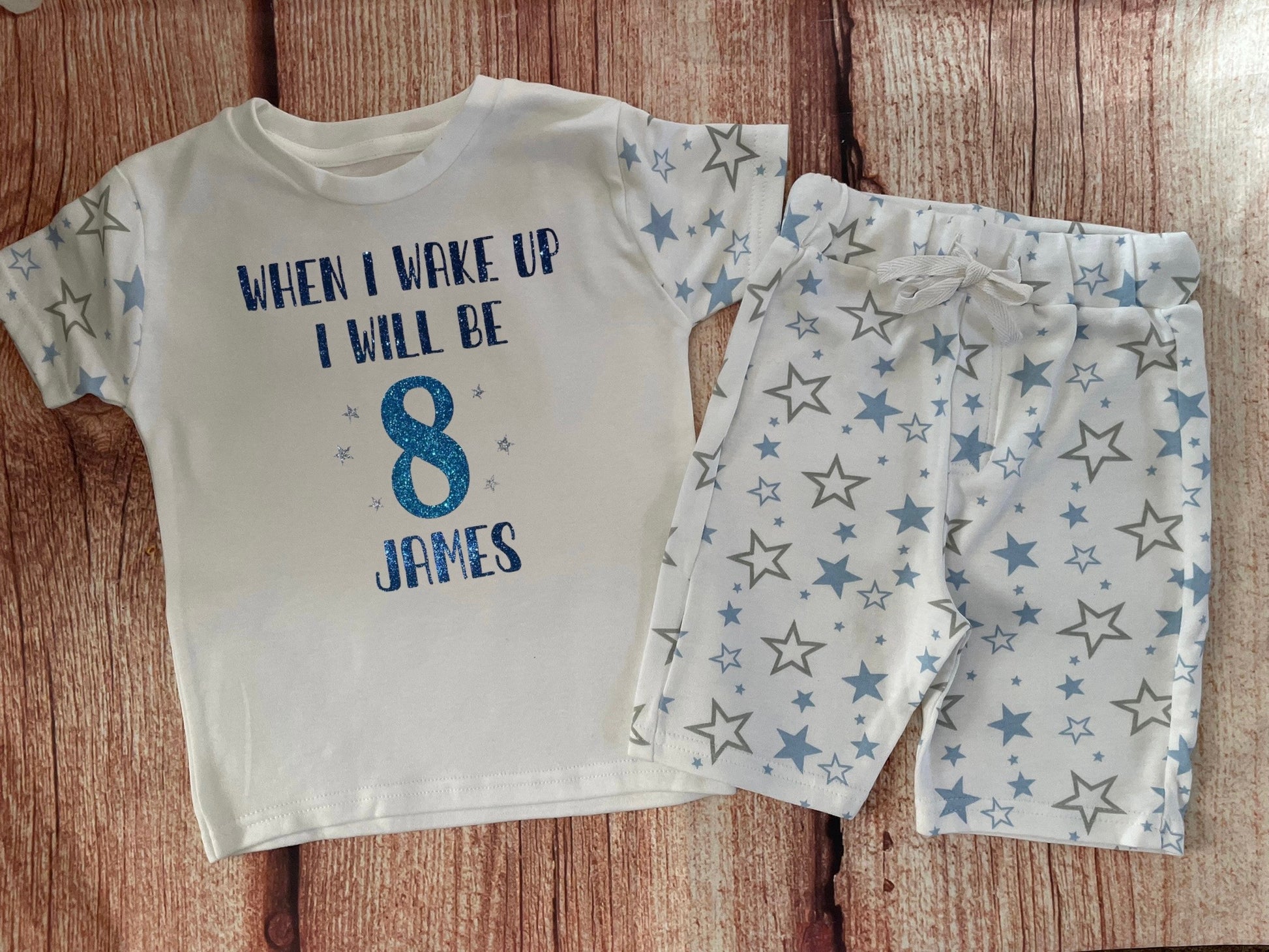 Birthday Sparkly Personalised Pyjamas, keepsake, Gift PJ, Shorts & T-shirt design
