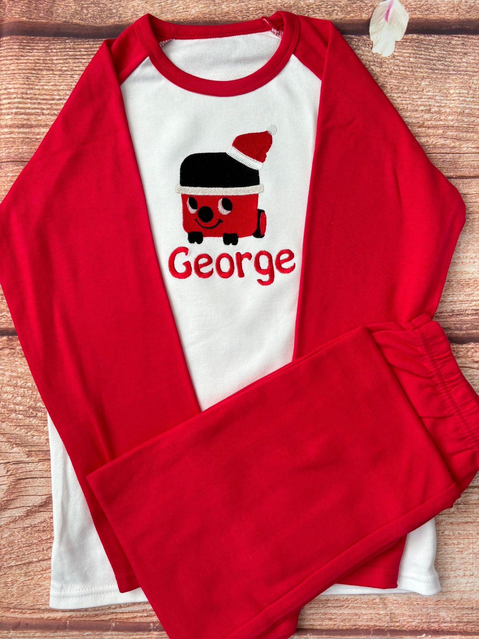 Christmas Henry Personalised Pyjamas. Embroidered with name & red hoover design.