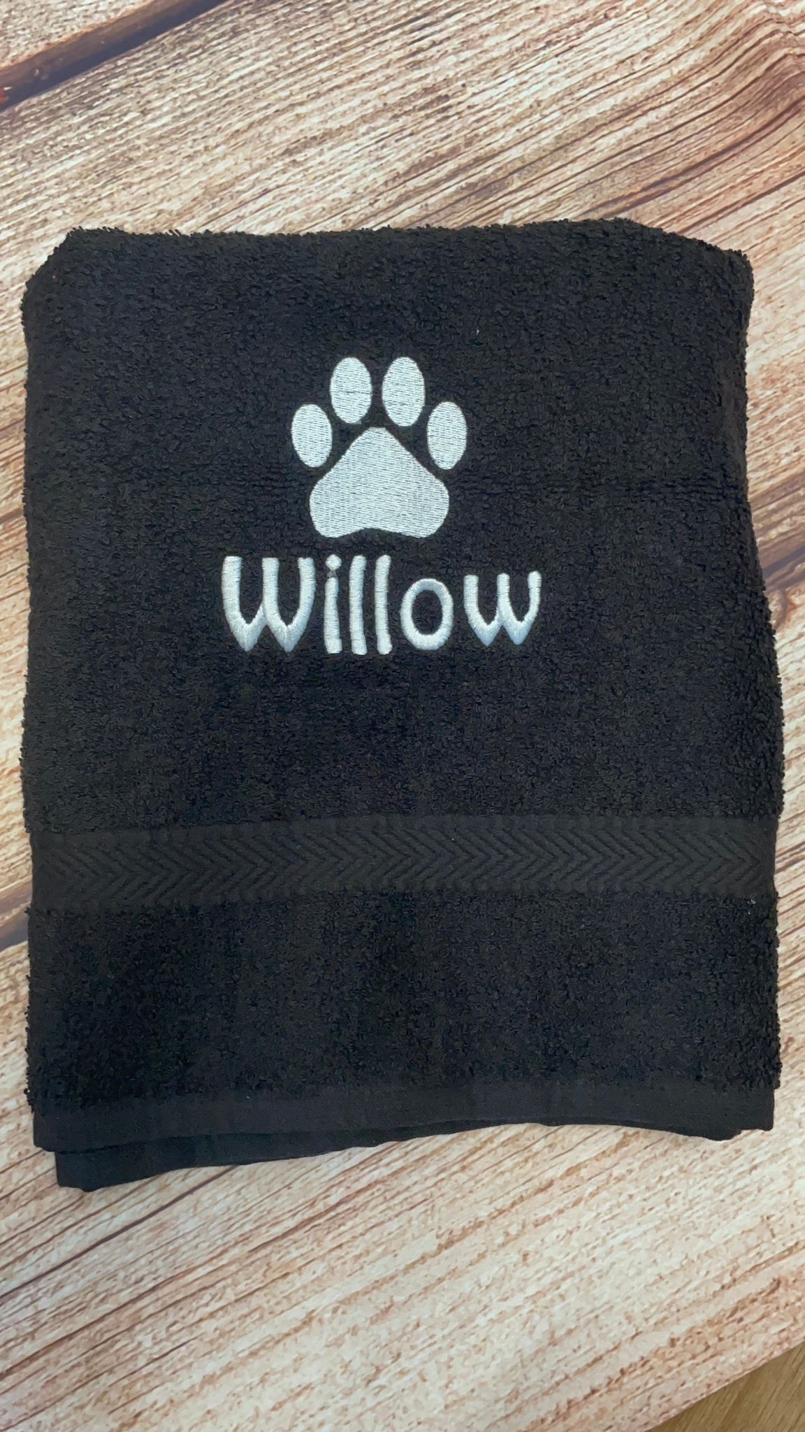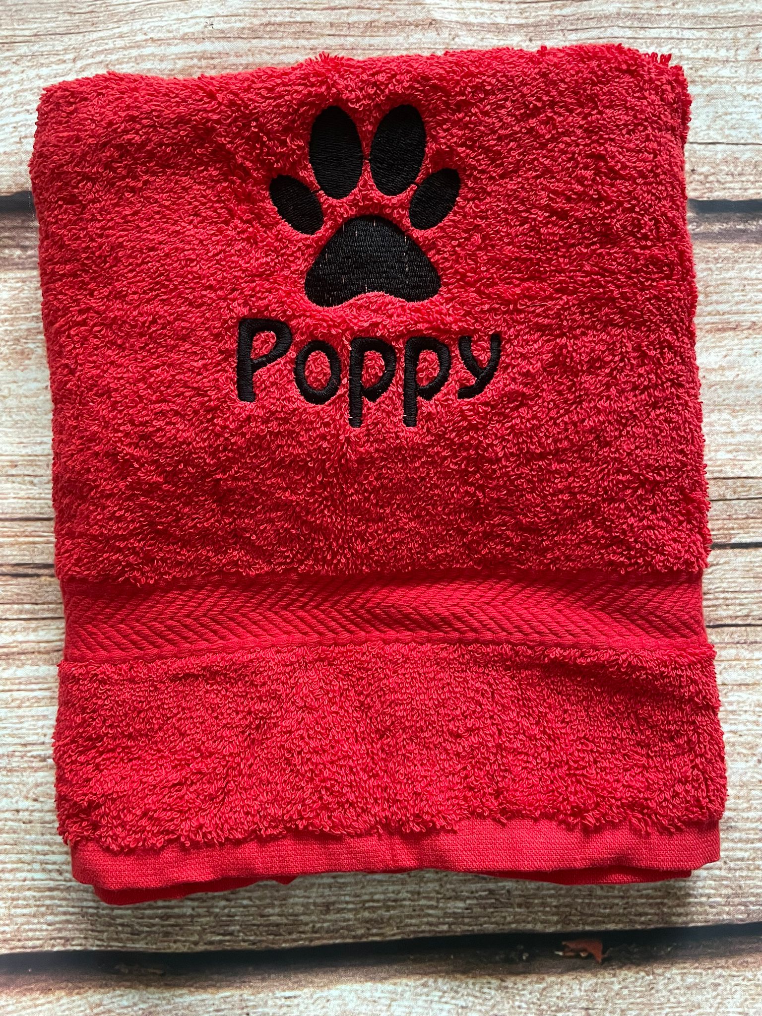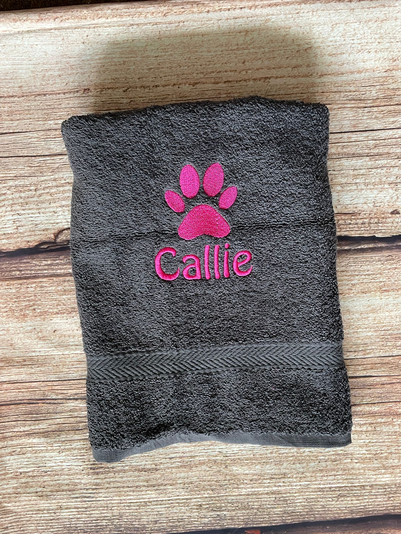 Small Dog towel, personalised with embroidered paw print and pet name.