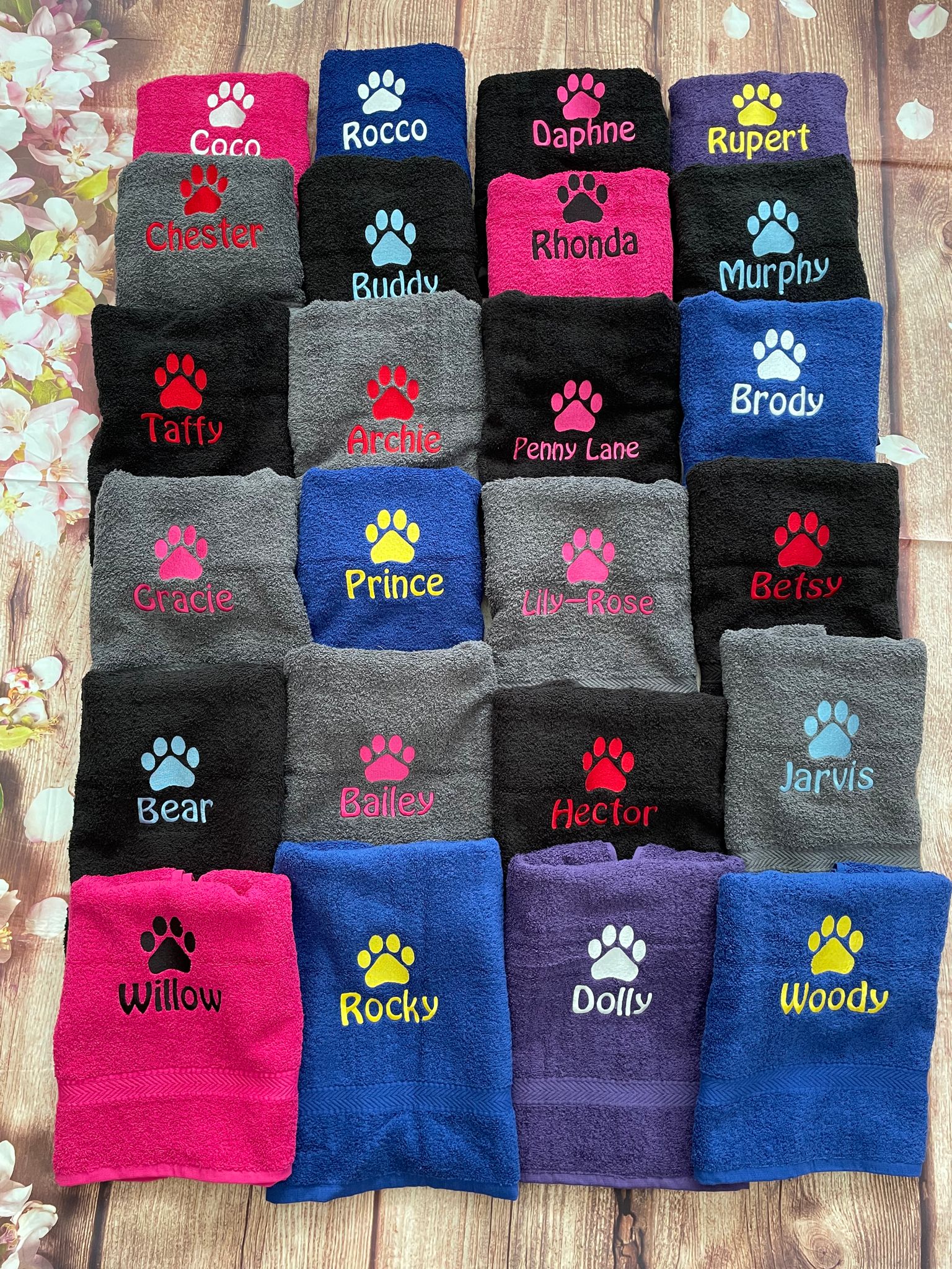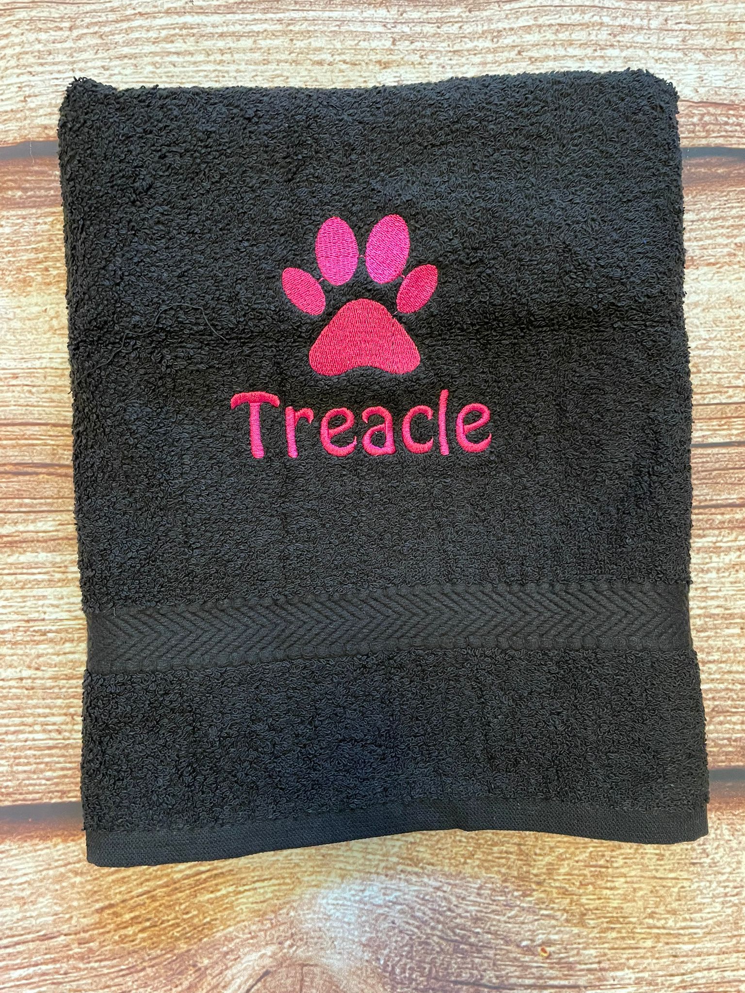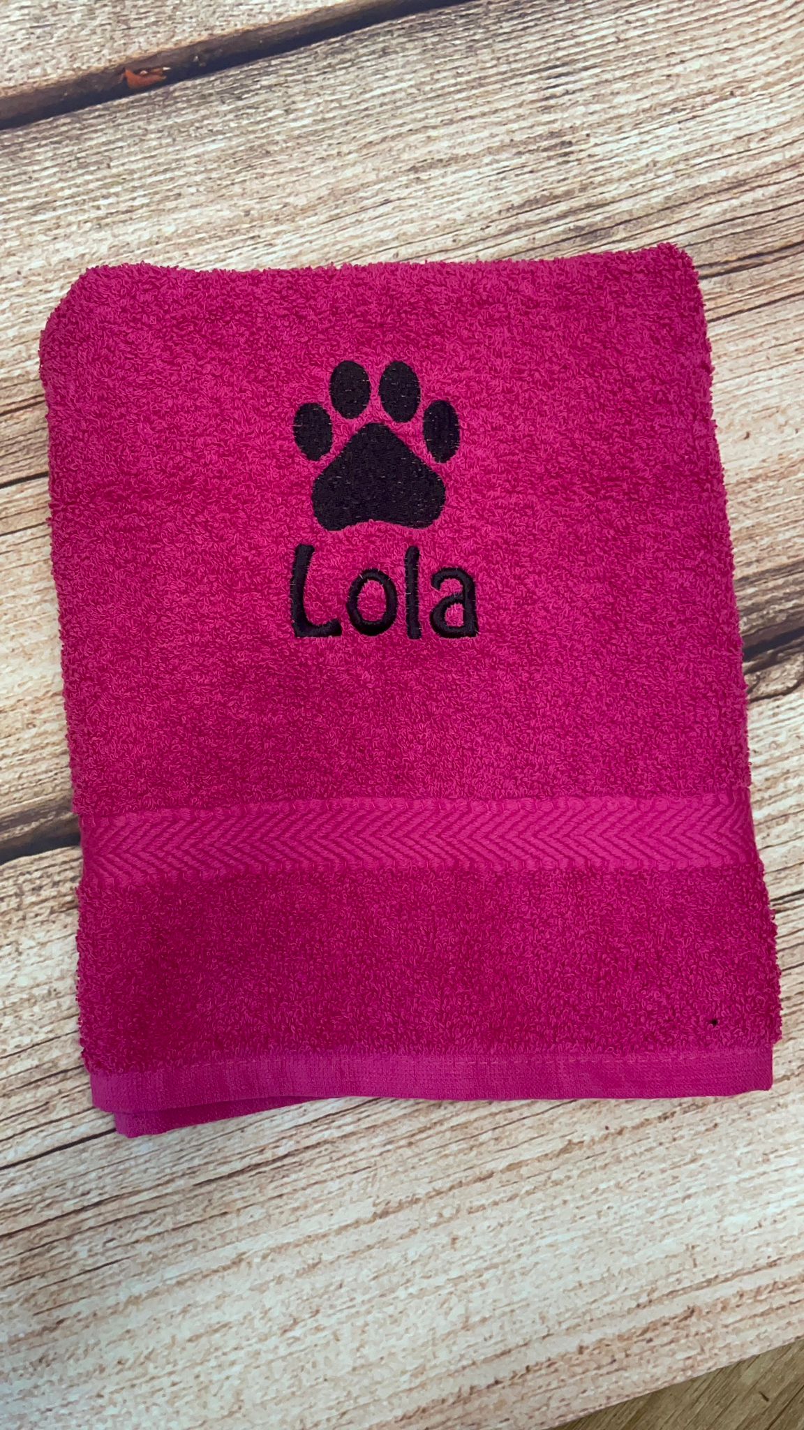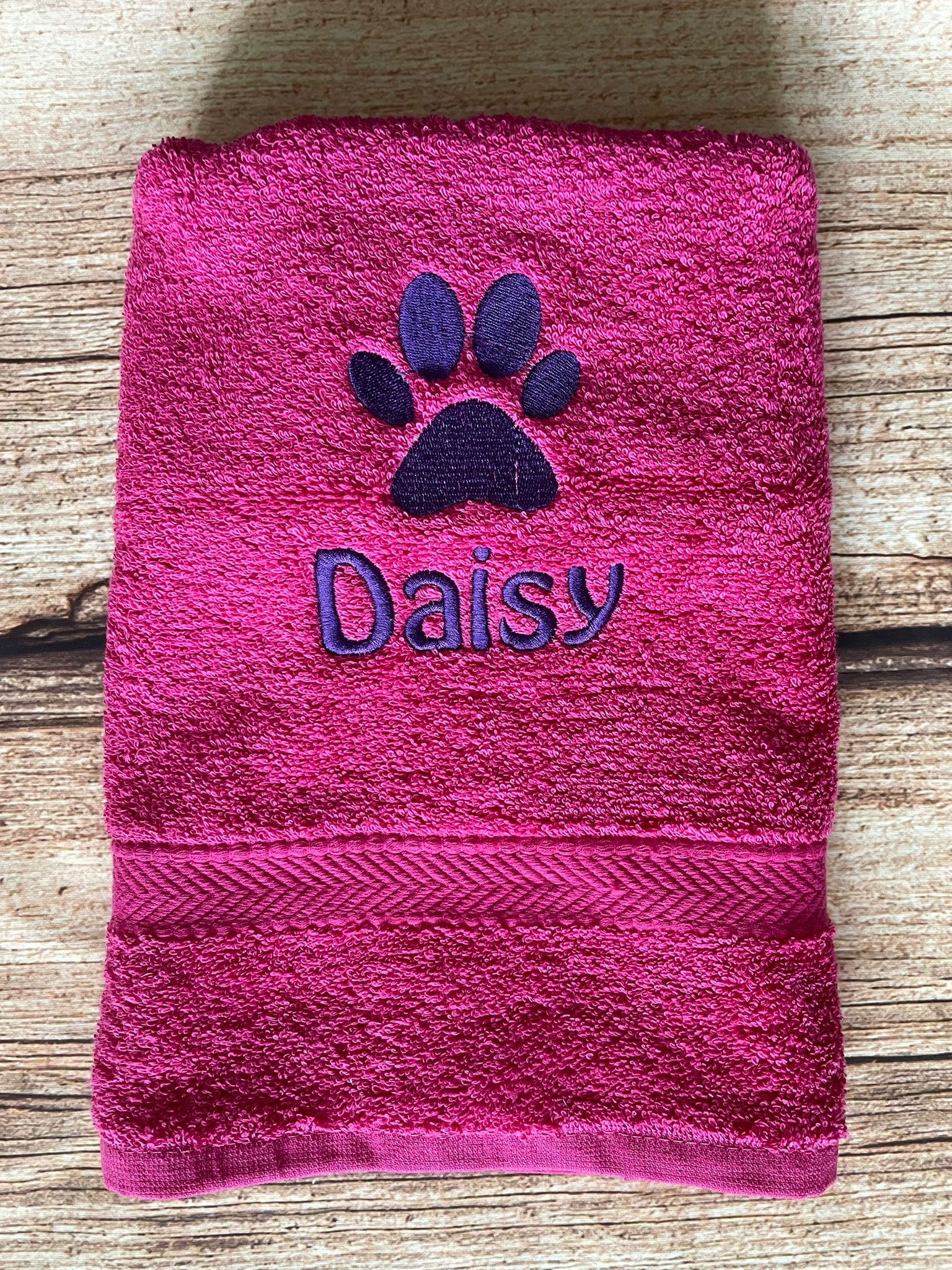 Small Dog towel, personalised with embroidered paw print and pet name.