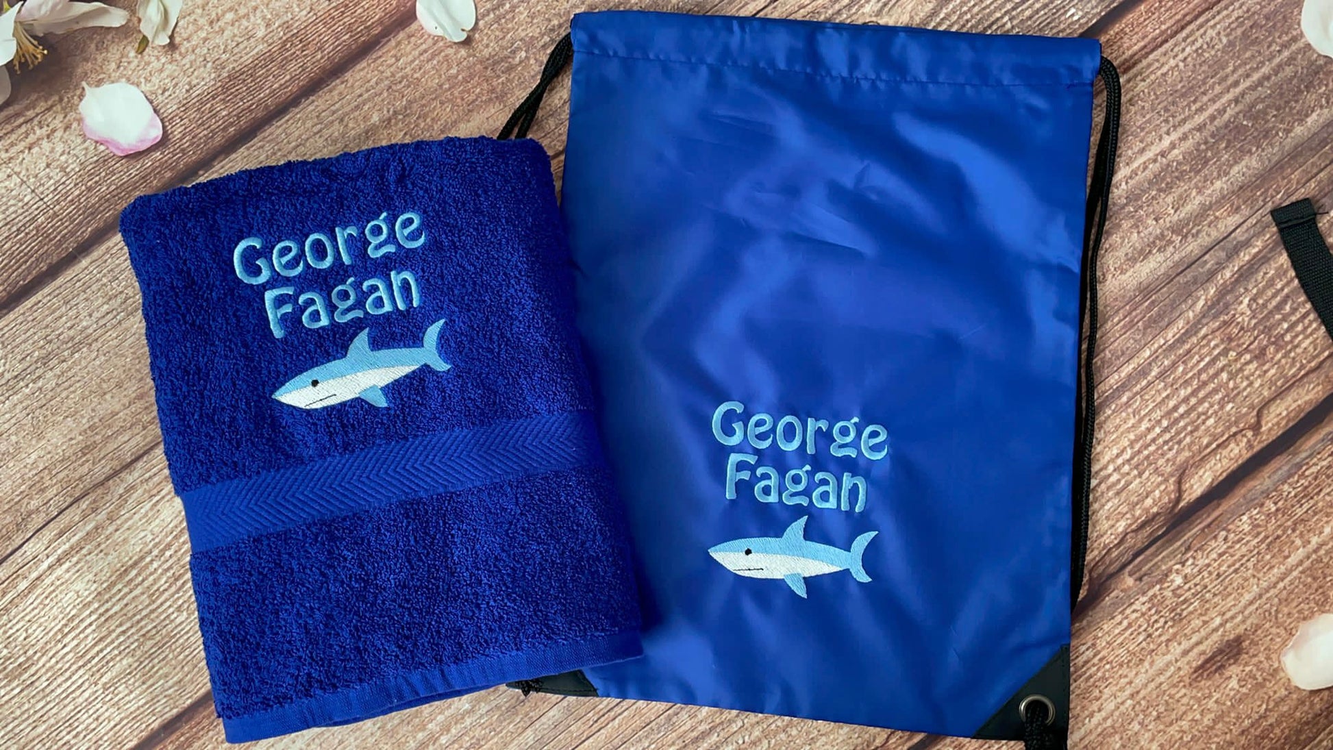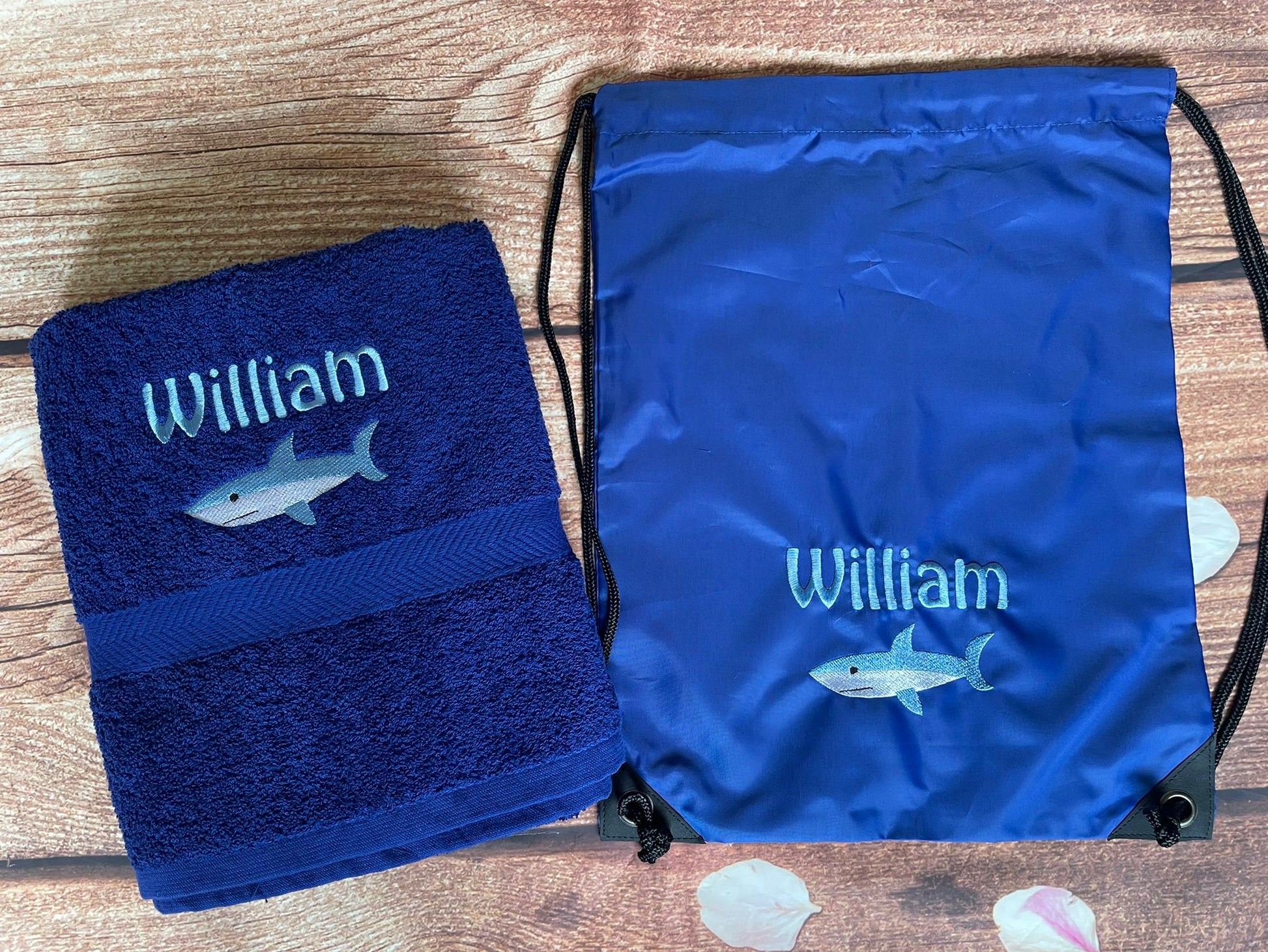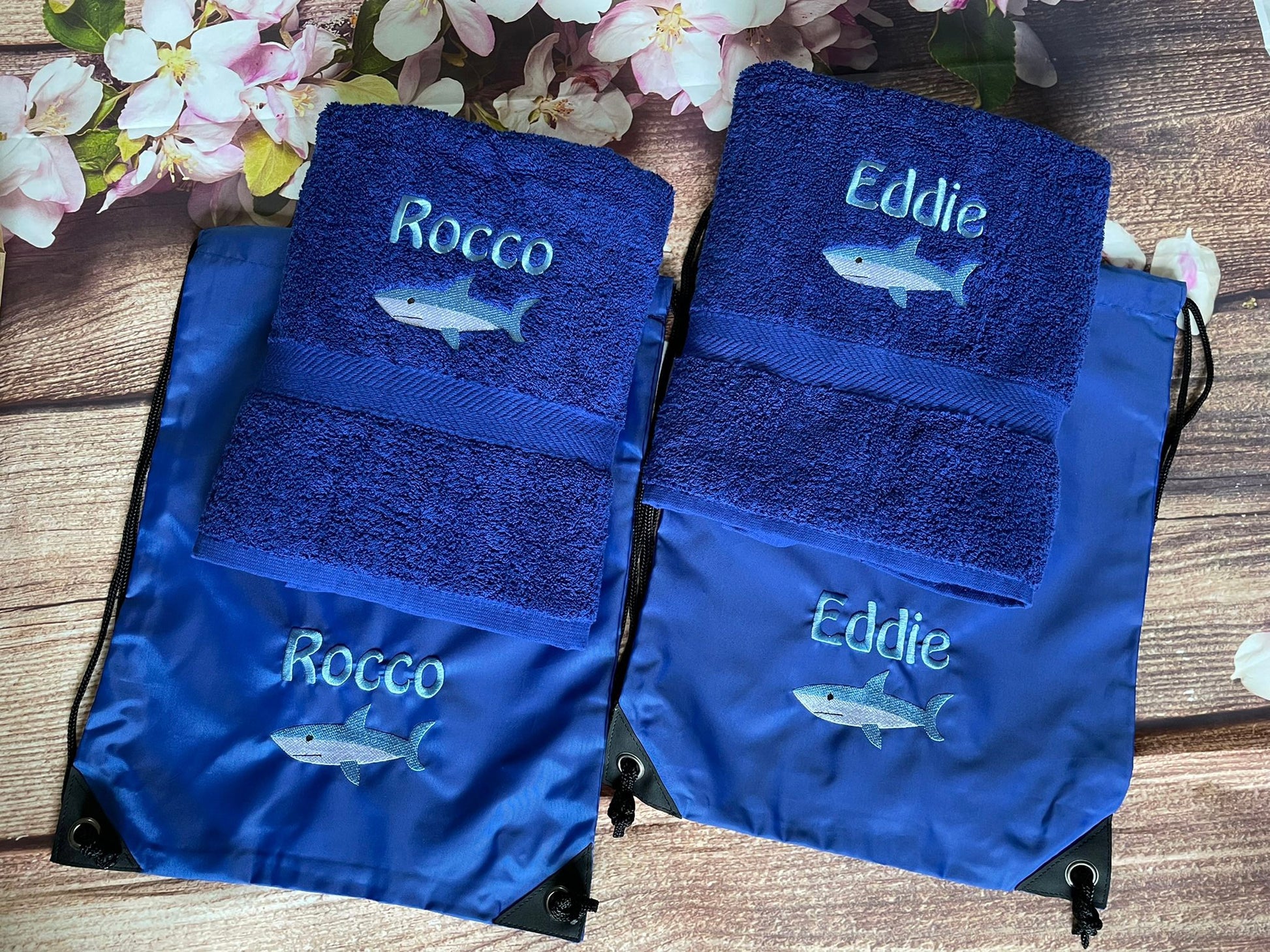 Beautiful 100% ring-spun cotton luxury bath towel professionally embroidered to make them one of a kind. These 550gsm towels measure approximately 70cm by 130cm and feature a herringbone border plus added hanging loop. Embroidered with our shark logo personalised with name of your choice. Our towels are big and soft, suitable for both adults and children.