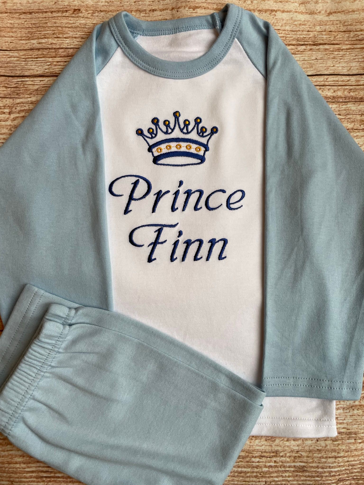 Personalised Embroidered 100% Cotton Prince Pyjamas - Blue.