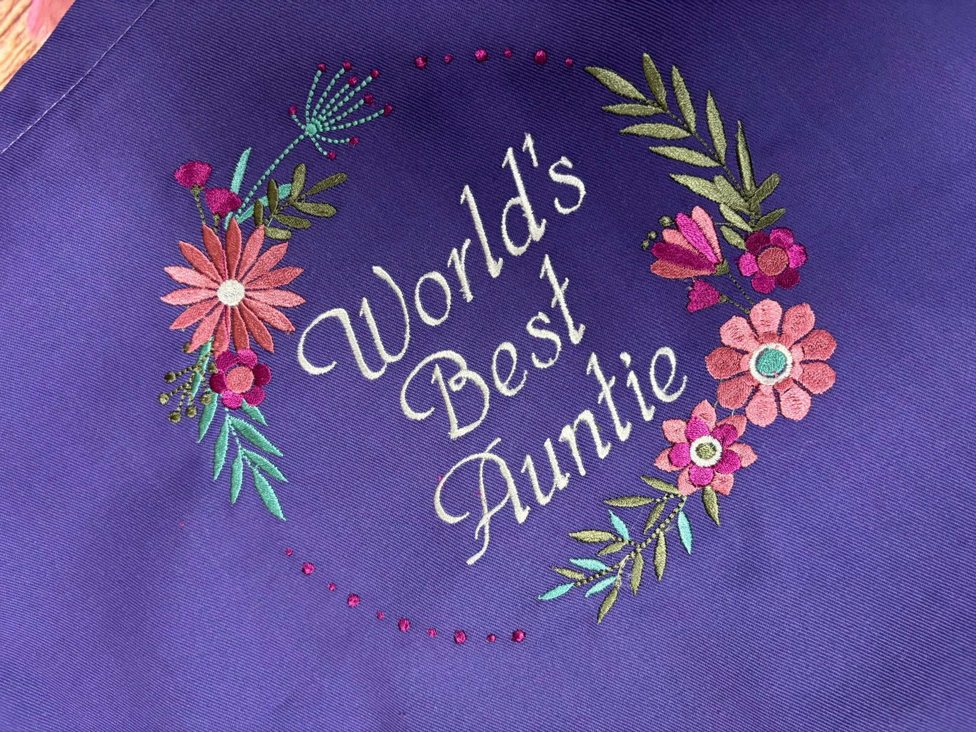 Celebrate the special women in your life with a beautifully embroidered apron, perfect for Mother’s Day, birthdays, or simply to show how much you care. Lovingly stitched with high-quality thread, the design features delicate flowers and your choice of wording — whether it’s "World’s Best Mum," "Nanny," "Mommy," or something uniquely personal. Please let us know the wording you require.