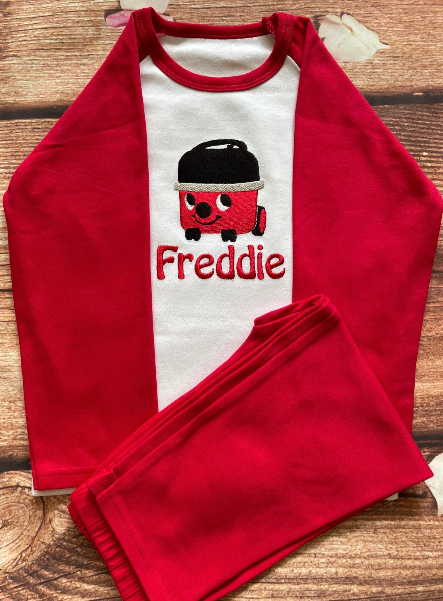 Personalised Pyjamas, embroidered with name & red hoover design. Gift, keepsake, high quality, soft, PJ's