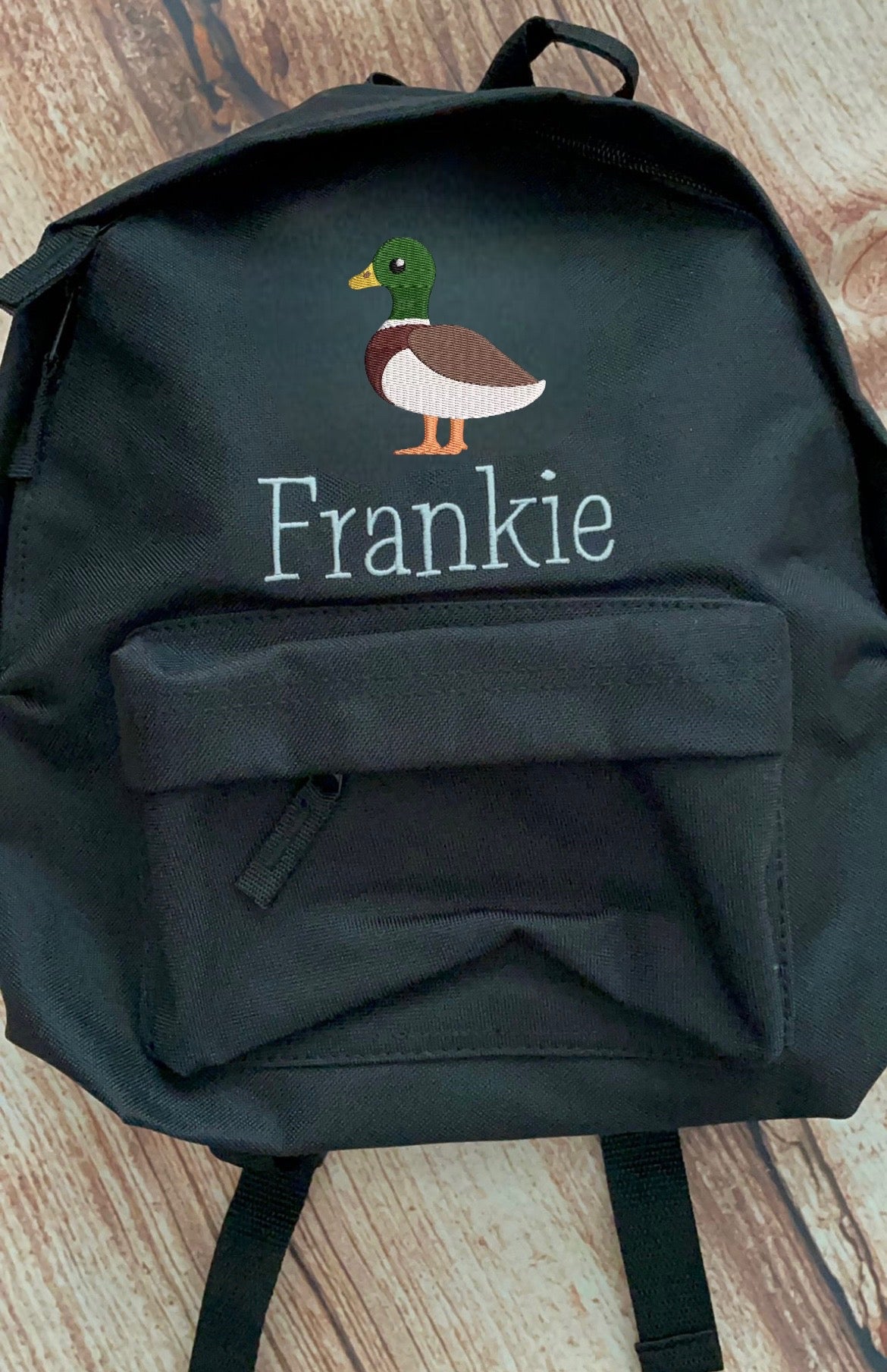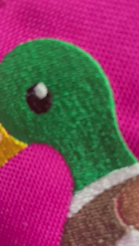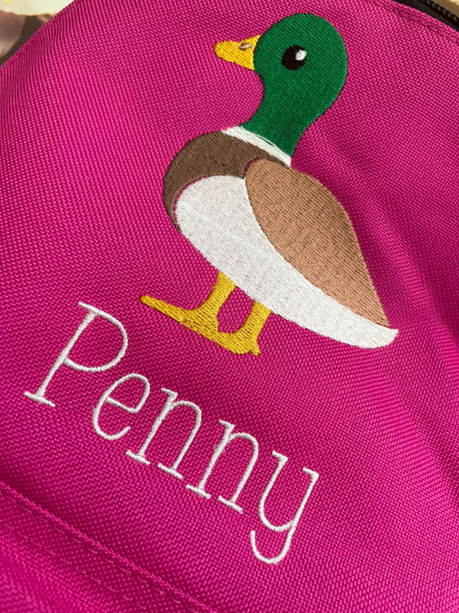Available in navy blue, royal blue, red, black and bright pink - personalise your bag with your Childs name and a cute Duck embroidered onto the front.