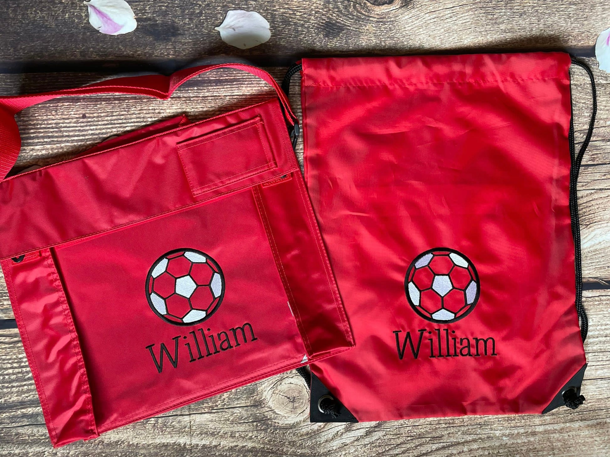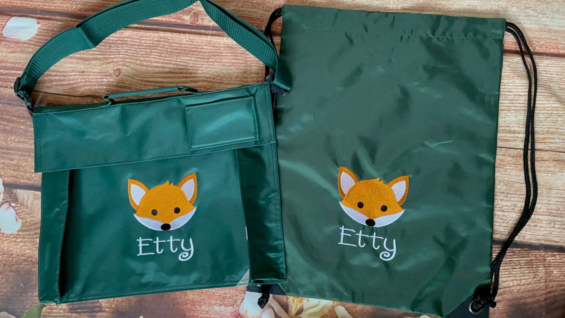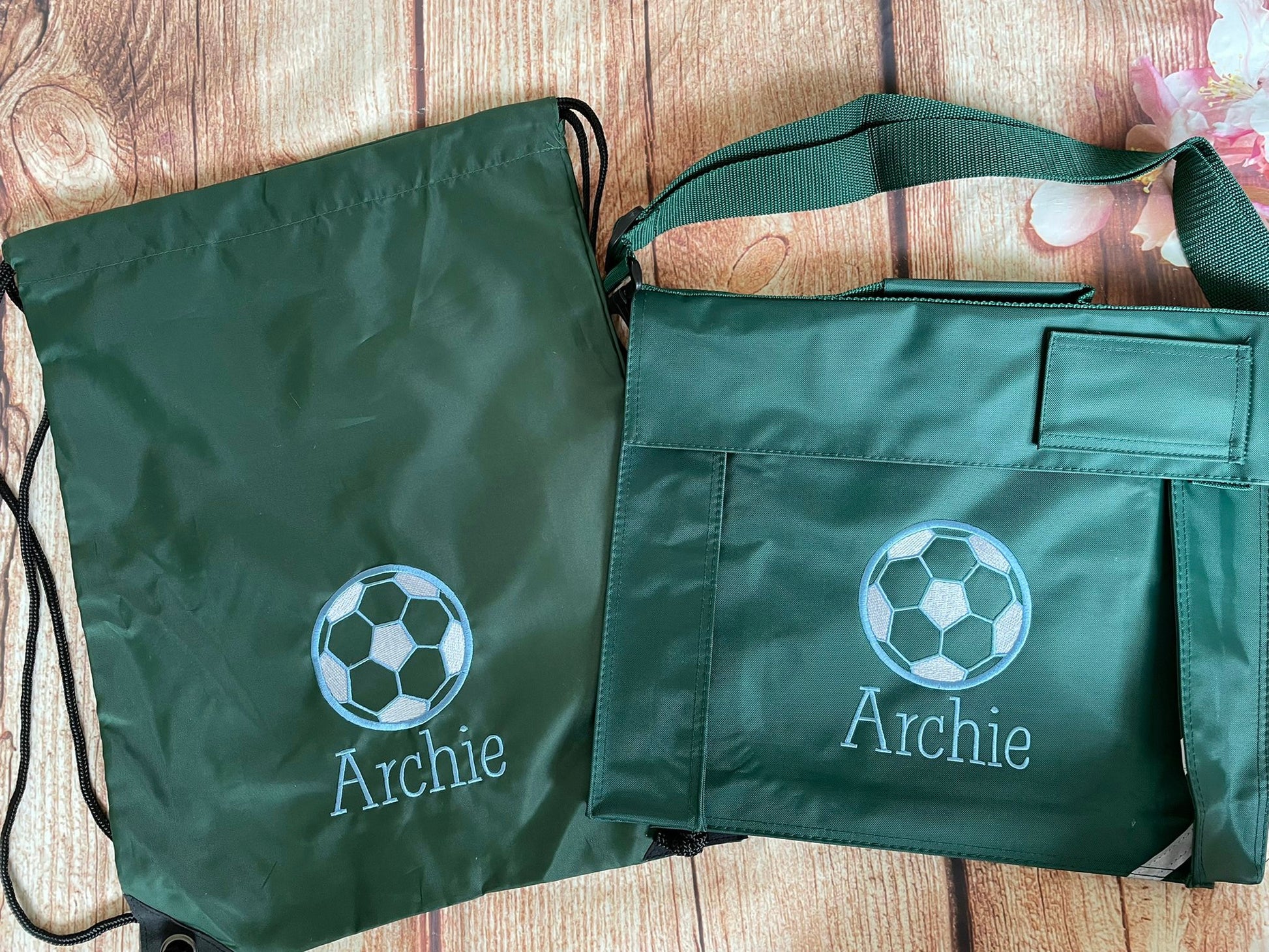 Set - matching book bag and pe bag for school. Personalised with name and motif.