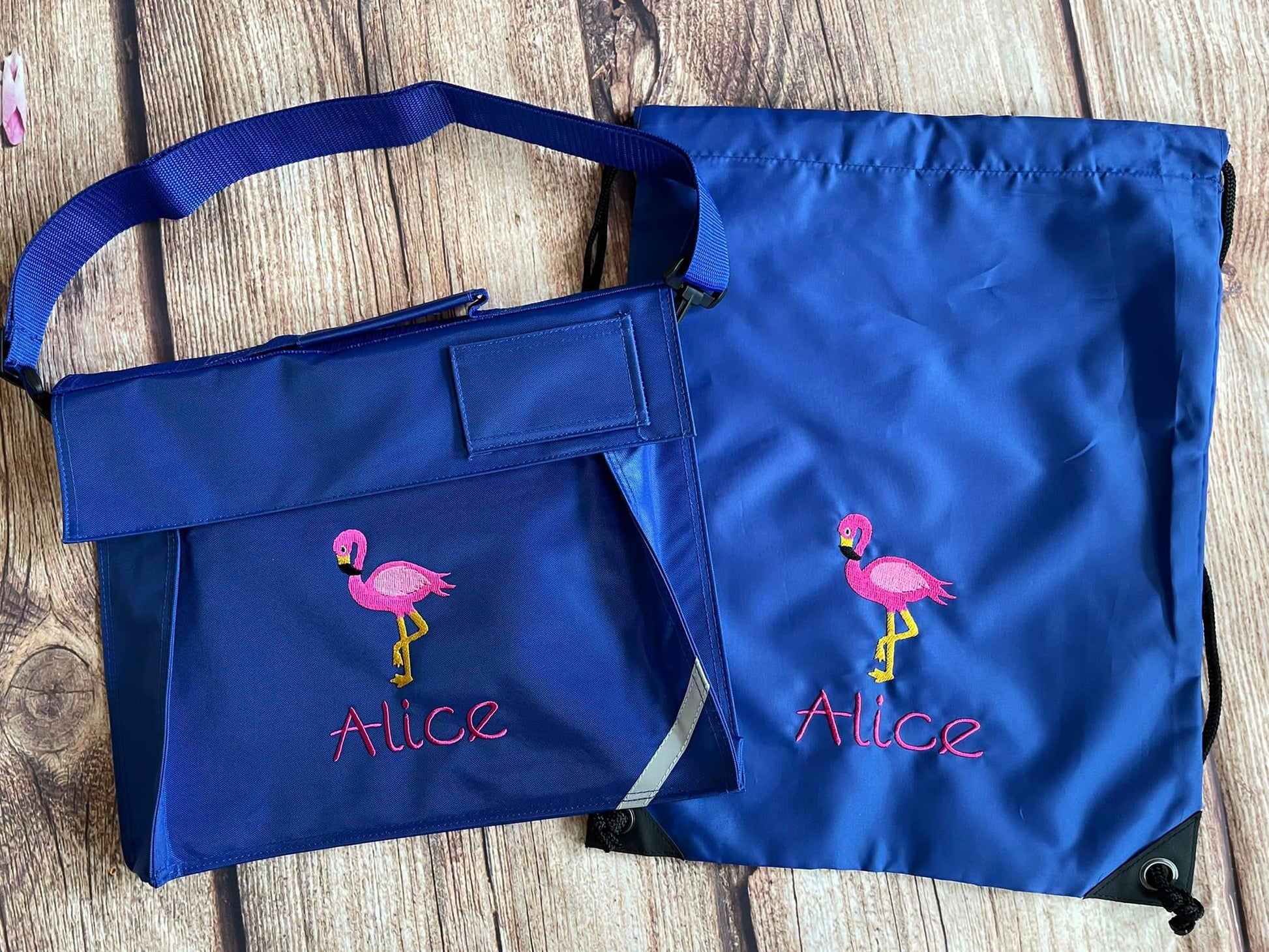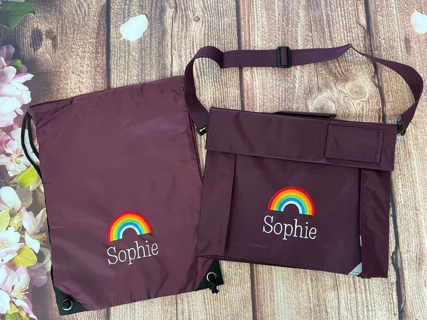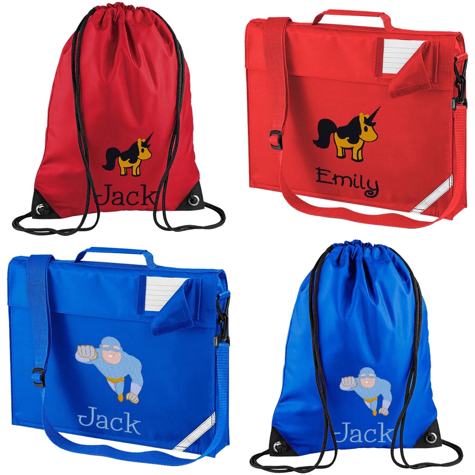 School book bag and pe bag set. Available in traditional school colours - red, royal blue, bottle green, burgundy and navy blue. Personalise with your name or initials along with the motif of your choice - this makes finding their bags amongst everyone else's much easier for your little ones.