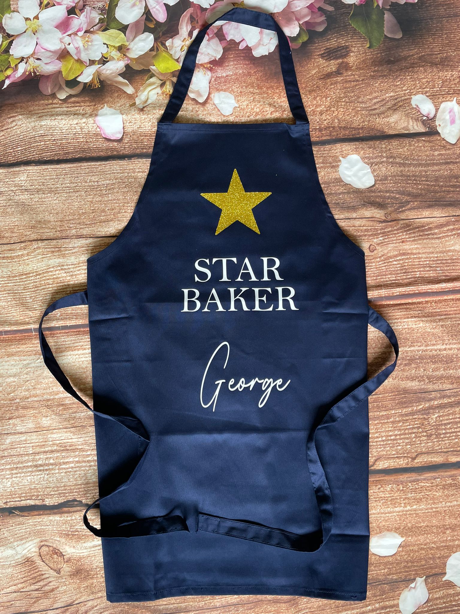 Aprons are personalised with a sparkly gold star, the wording 'Star Baker' plus a name of your choice. Please include name in the Personalisation box before checkout.